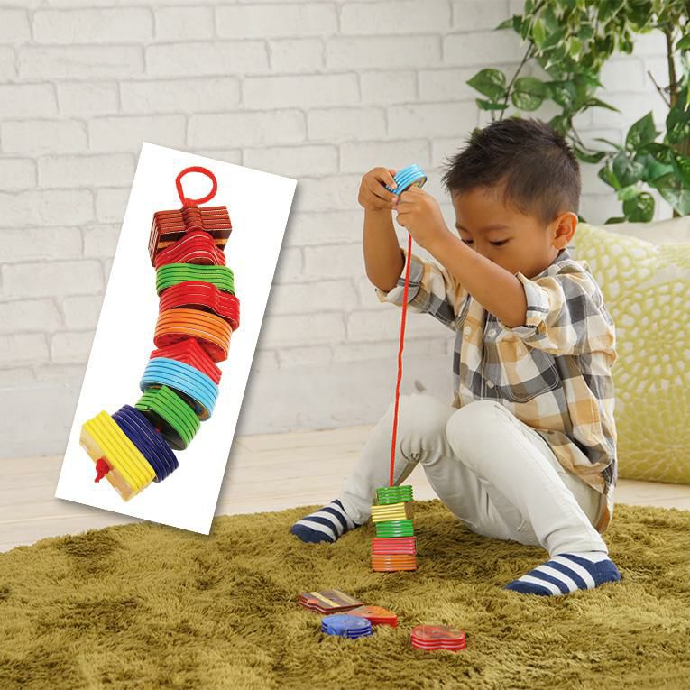 | 備考 | 読んで、繋いで遊ぶひも通しおもちゃ。 木製ビーズは本のようになっており、各パーツにちなんだ英語を学ぶことができます。 紐に通して遊ぶことで、指先の発達も促します。 本製品はヨーロッパの安全基準CEに適合しており、小さなお子様でも安全にお使いいただけます。
