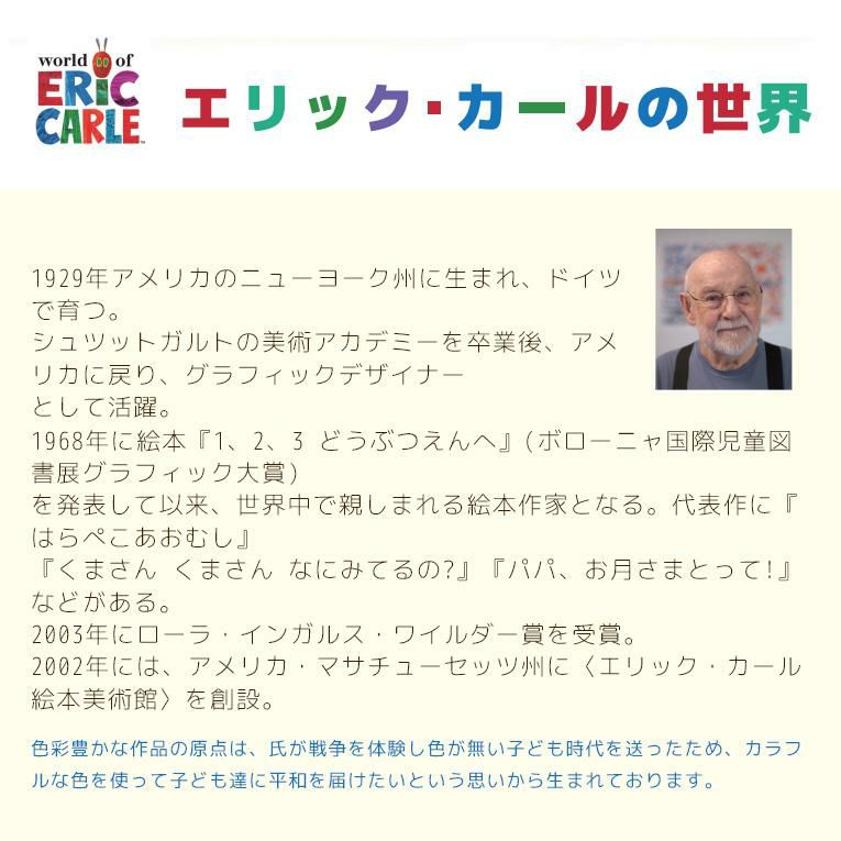 1929年アメリカのニューヨーク州に生まれ、ドイツで育つ。グラフィックデザイナーとして活躍後、1968年に『1、2、3どうぶつえんへ』を発表し、ボローニャ国際児童図書展グラフィック大賞を受賞。以来、世界的な絵本作家として創作を続ける。代表作に『はらぺこあおむし』『パパ、お月さまとって!』『だんまりこおろぎ』など多数。2003年ローラ・インガルス・ワイルダー賞受賞。