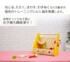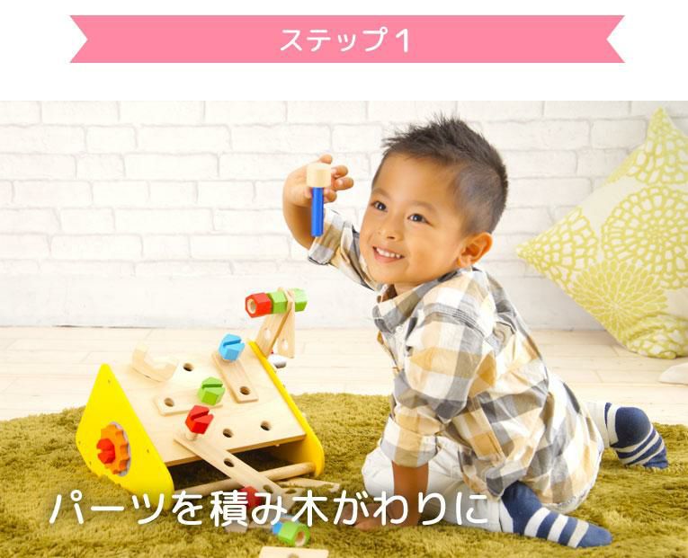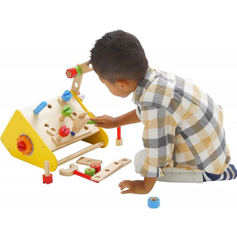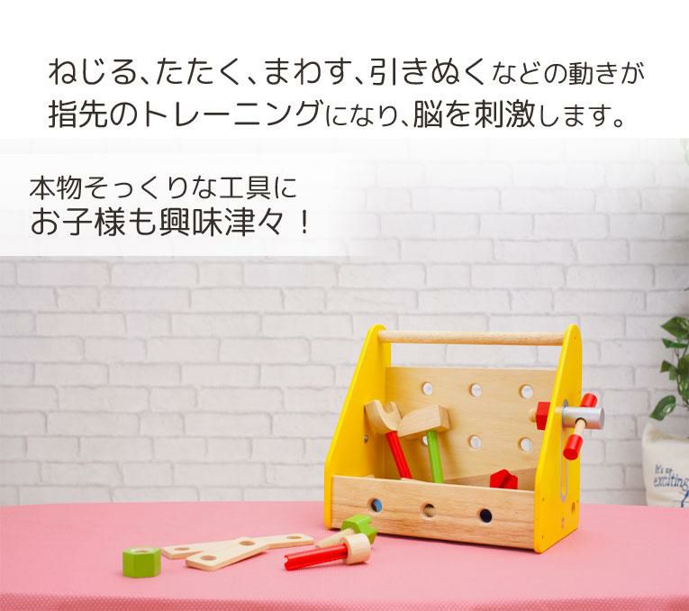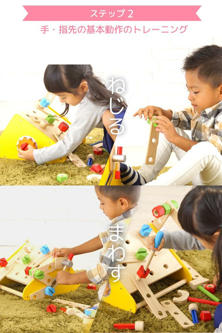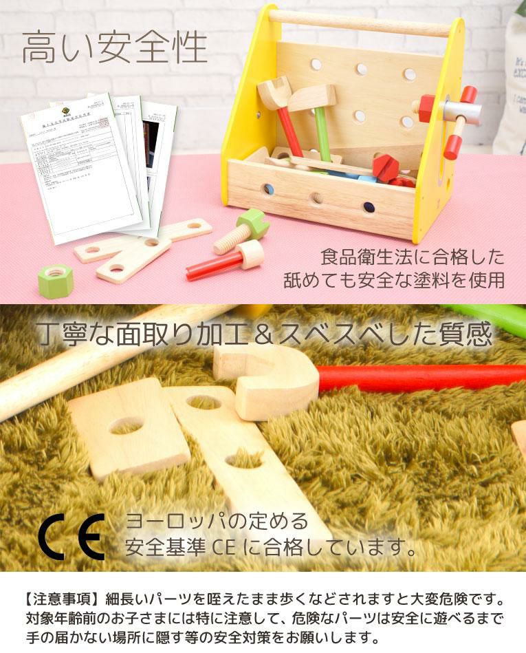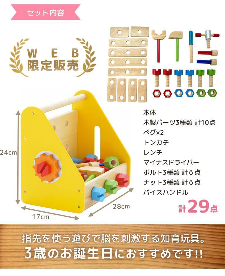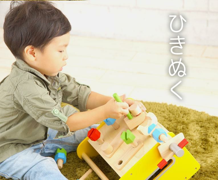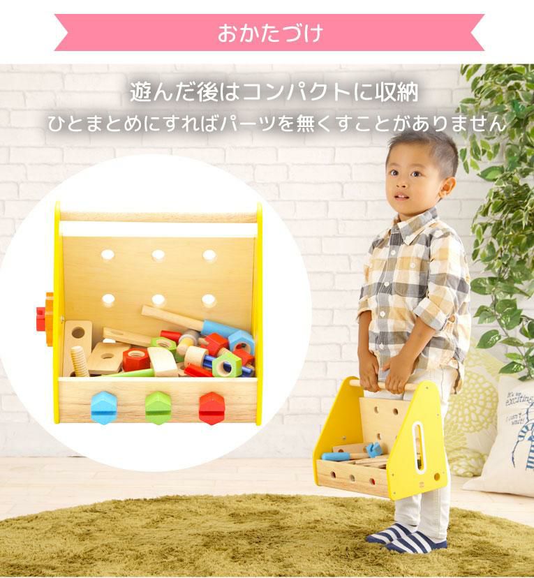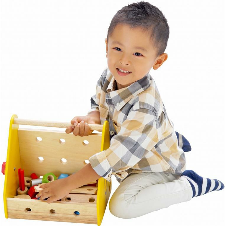 | 備考 | 大工セットのボックスタイプ。ボルトやナット、パーツを組み合わせて色々な形も作れるボリュームたっぷりの大工遊び。 色々なパーツをネジでとめる単純な遊びから、様々な形を作る高度な遊びまでお子様の創造力や好奇心を育み、指先の発達も促します