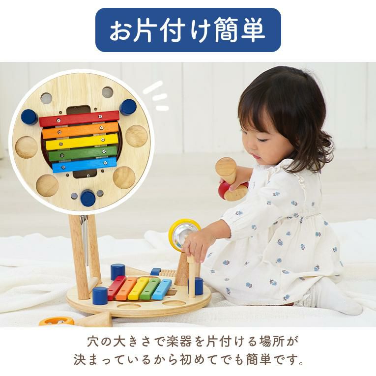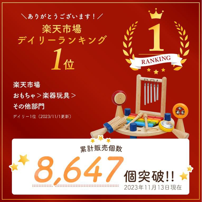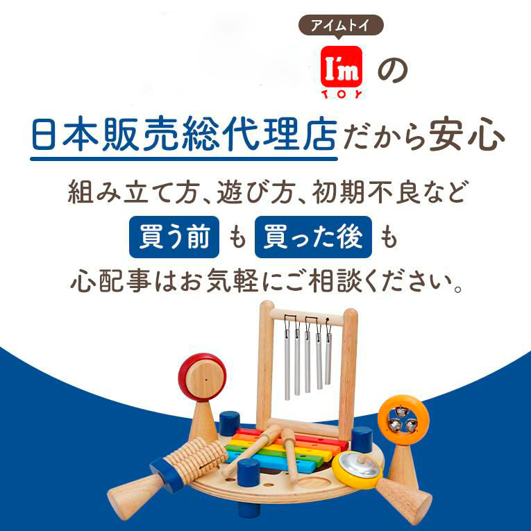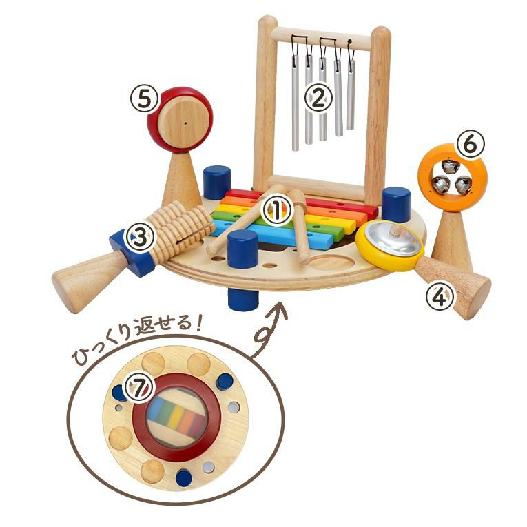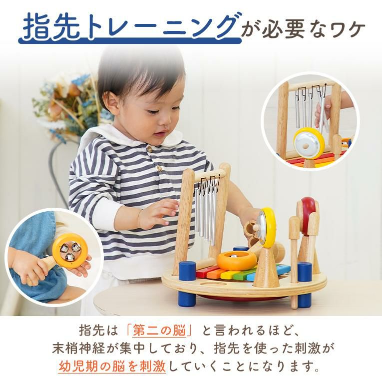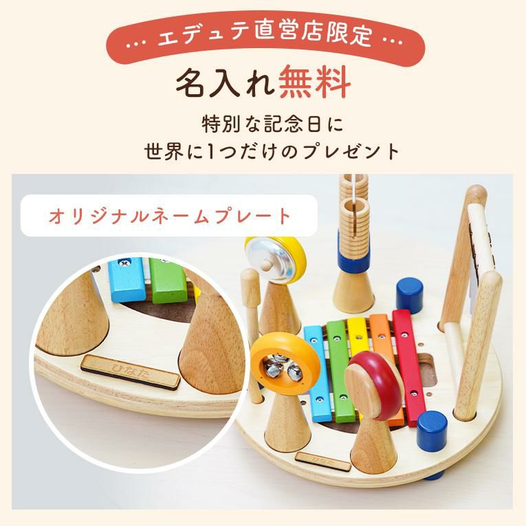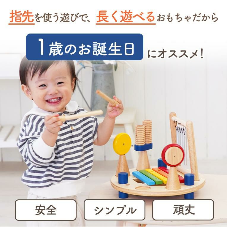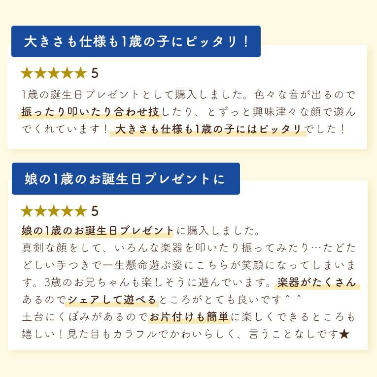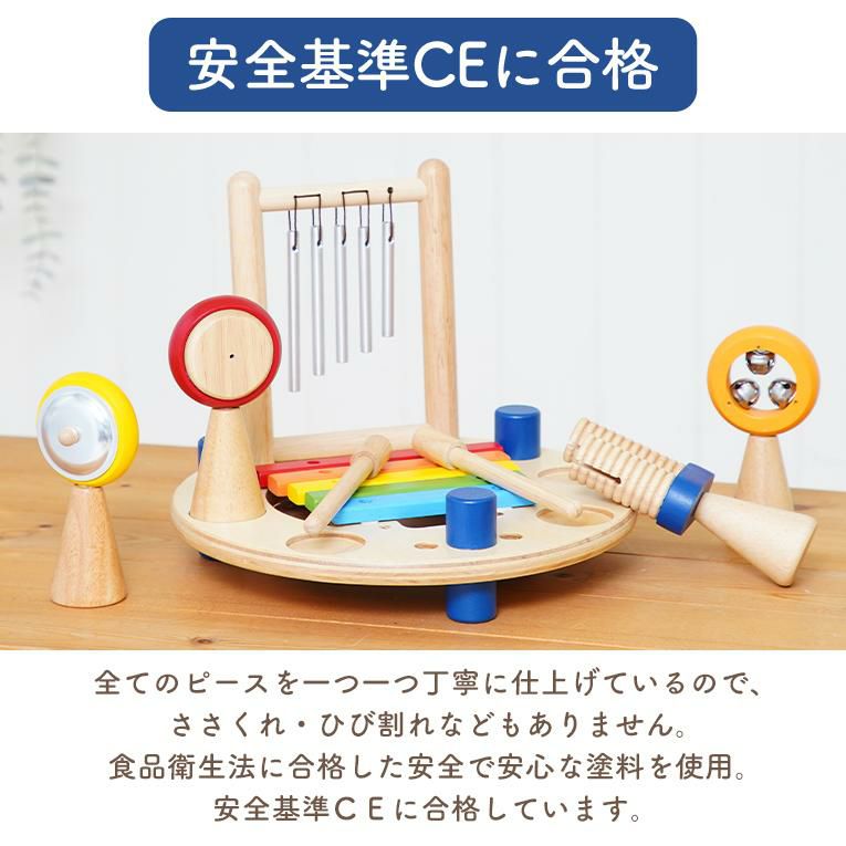 | 備考 | 大人気のロングセラー商品が低月齢から遊べる仕様になって新登場!たくさんの音遊びが1台で遊べるのが最大の魅力です。小さなお手てでも持ちやすいように楽器の持ち手は安定感のある形になっており、喉突きの危険もありません。多くの音遊びに触れることができますので、お子様の指先の発達をリズミカルに演出します。天然木のぬくもり・舐めても安全な塗料を使った木のおもちゃです。