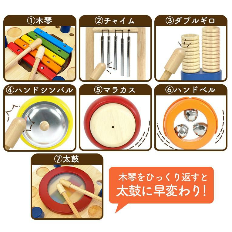 | セット内容 | 本体(木琴・太鼓)×1、マラカス、ハンドベル、ハンドシンバル、カスタネット、トライアングル、ダブルギロ、チャイム×各1、バチ ×4