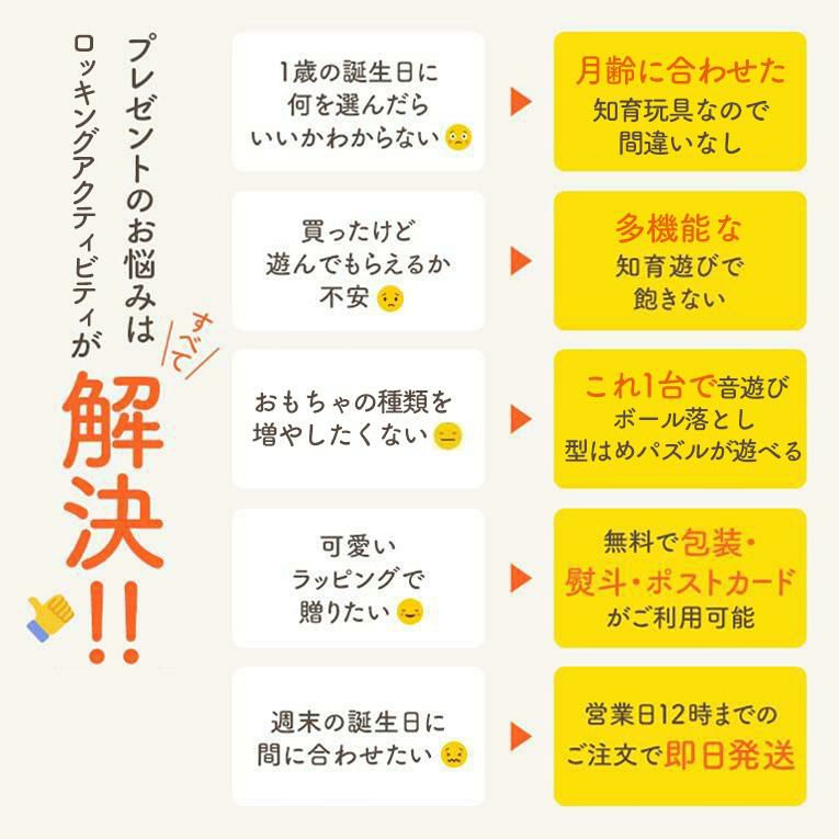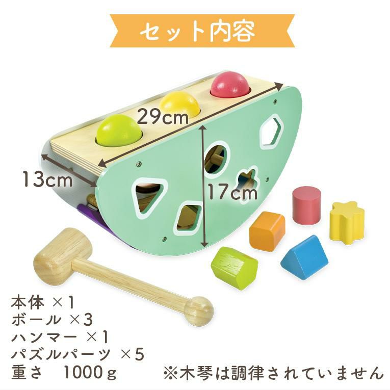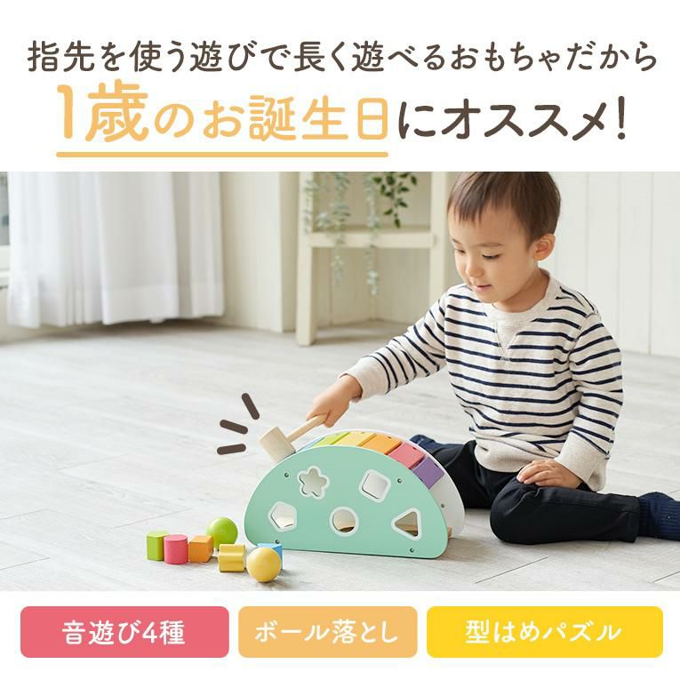 | 備考 | ソフトカラーがかわいい本体には音遊び(太鼓、 ギロ、シンバル)、型はめ、ボール叩きなどベーシックな遊びが詰まっている木のおもちゃです。木琴に見立てたレインボーのアーチを叩いても楽しめます。