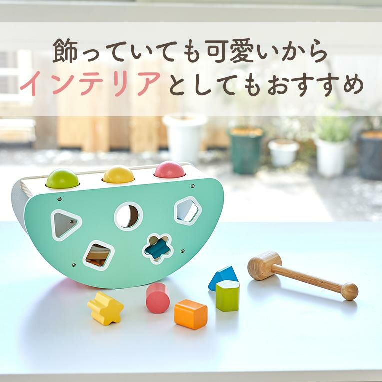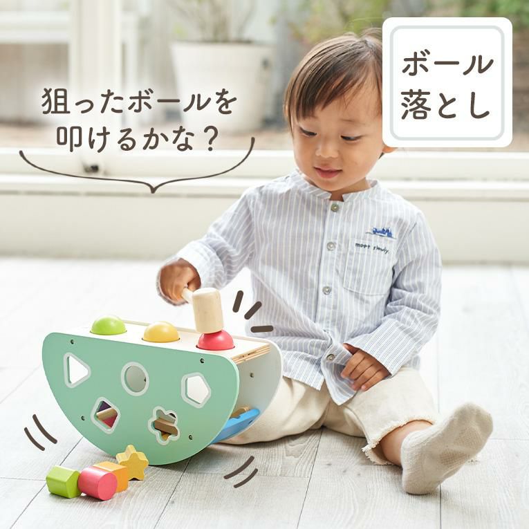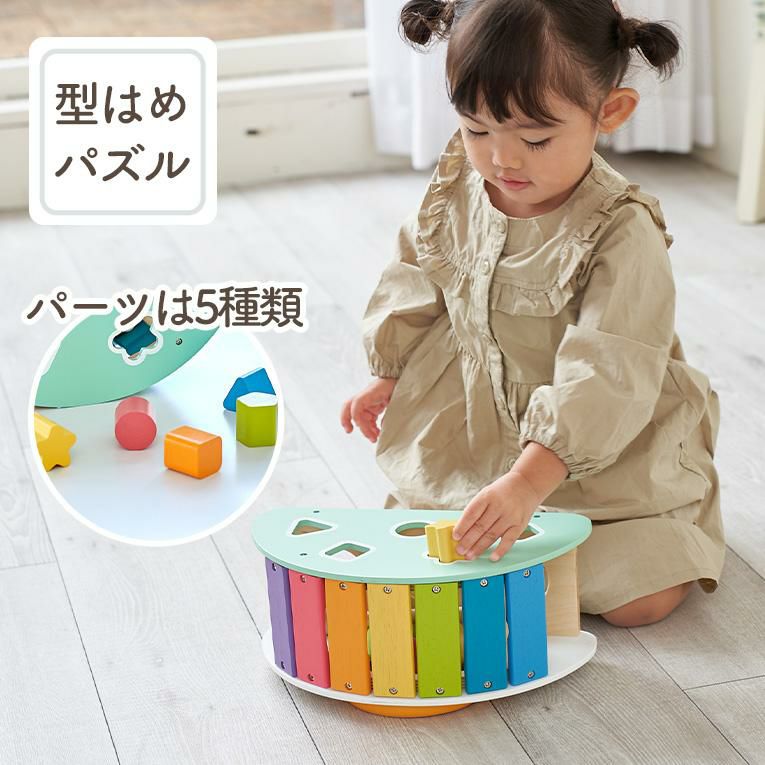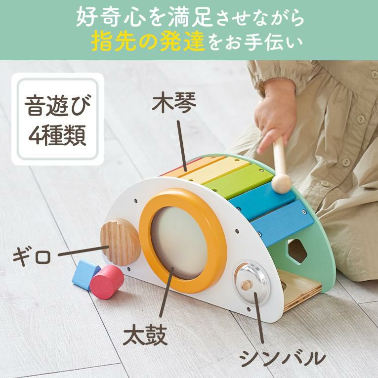 可愛いソフトカラーの本体には音遊び(太鼓、 ギロ、シンバル)、型はめ、ボール落とし、型はめなどベーシックな遊びが詰まっている木のおもちゃです。