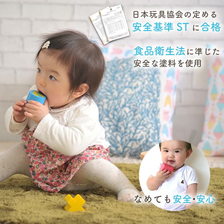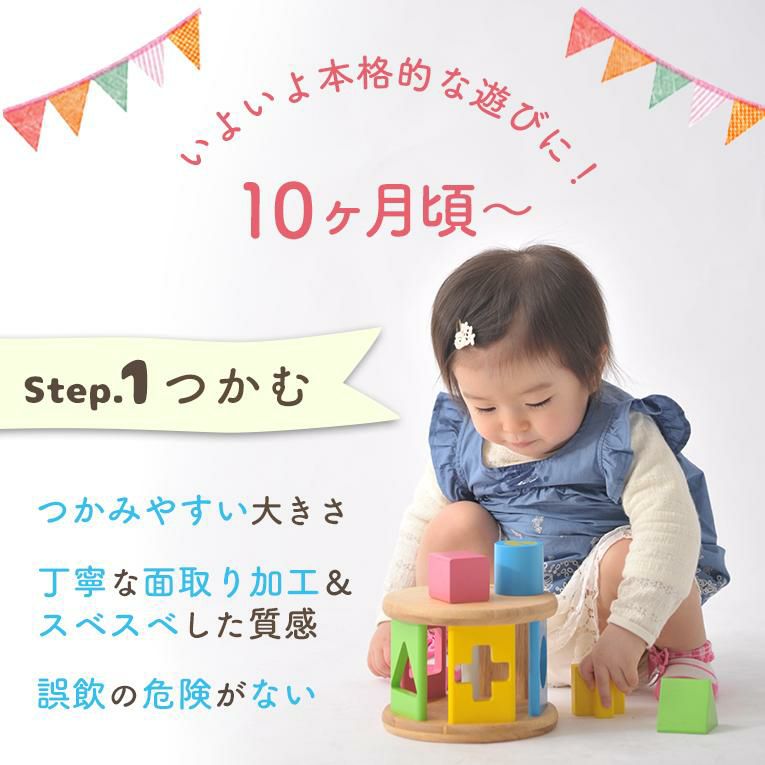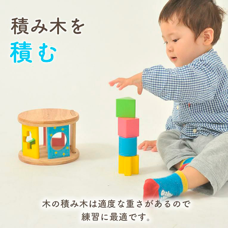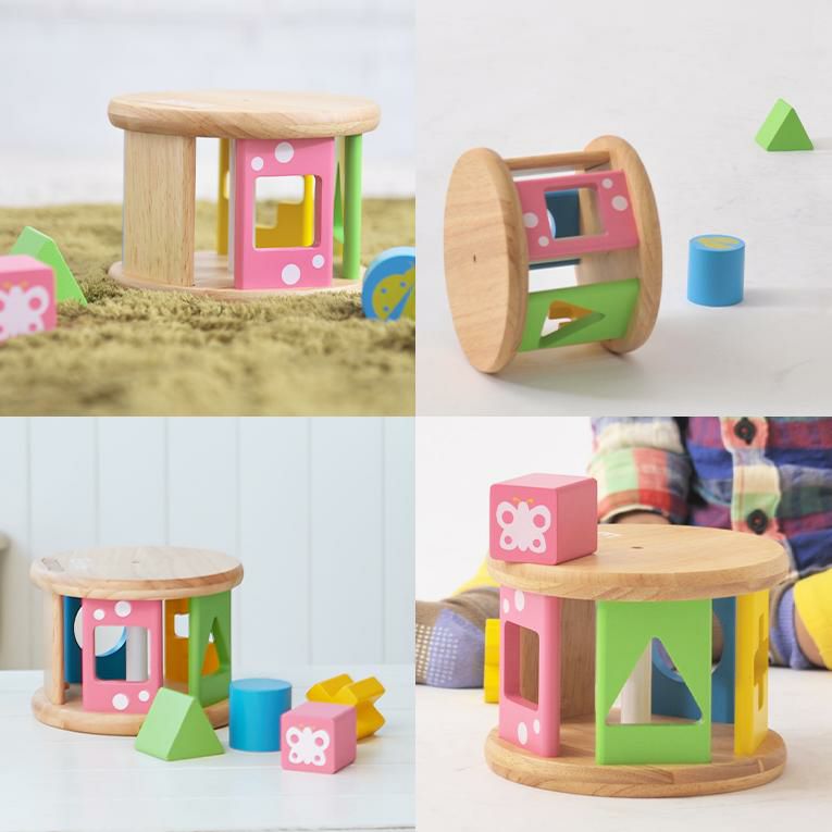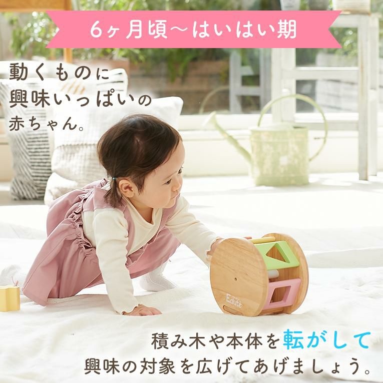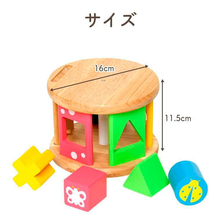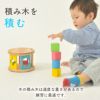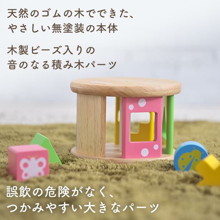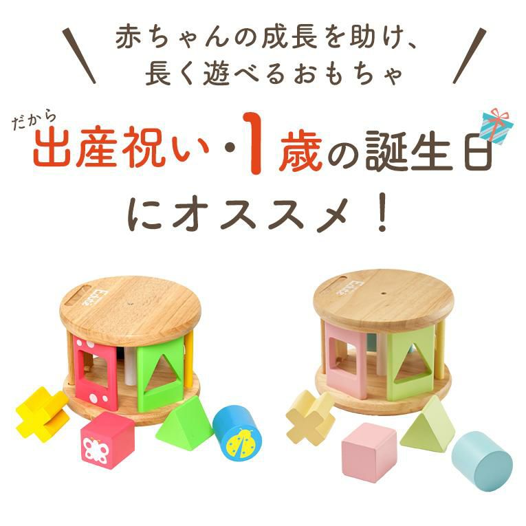 | 備考 | 赤ちゃんの成長に合わせて、ドラム型の本体を転がしたり、ブロックを振って音遊びを楽しんだり、 大きくなったら色分け・カタチ分けといった知育要素を盛り込んだ遊びでも楽しめる、赤ちゃんにピッタリの木のおもちゃのファーストトイ。 やさしい天然木のぬくもりに触れながら、転がし遊びやパーツ遊びで「指先を使う」能力を育み、楽しみながら学ぶことができます。 ピンクとブルーのパーツには音の仕掛けも♪