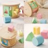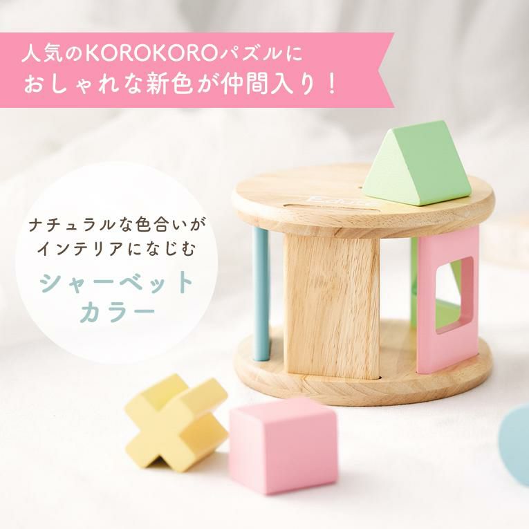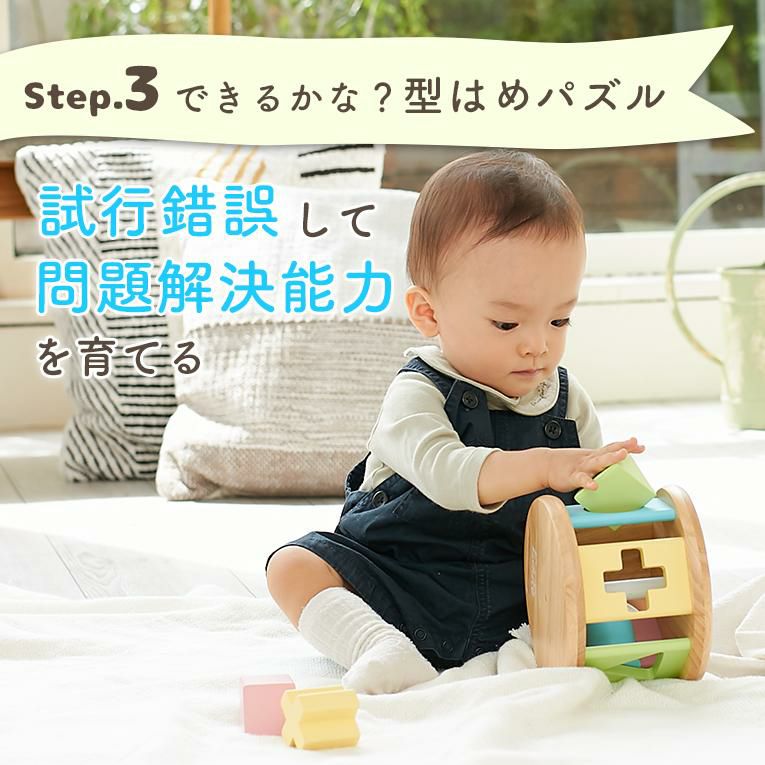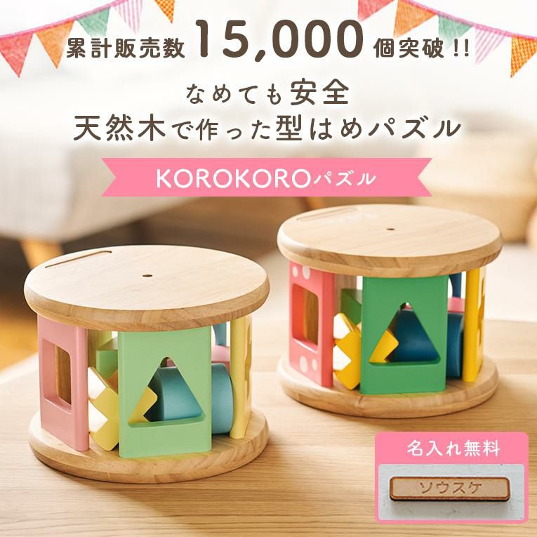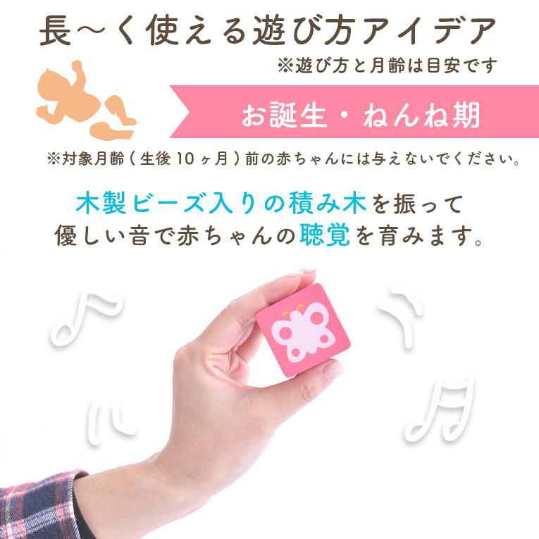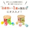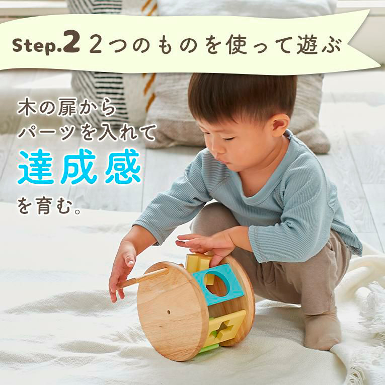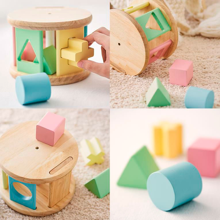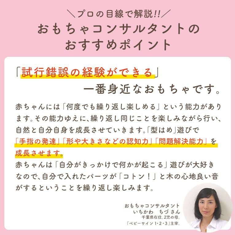 | 備考 | 赤ちゃんの成長に合わせて、ドラム型の本体を転がしたり、ブロックを振って音遊びを楽しんだり、 大きくなったら色分け・カタチ分けといった知育要素を盛り込んだ遊びでも楽しめる、赤ちゃんにピッタリの木のおもちゃのファーストトイ。 やさしい天然木のぬくもりに触れながら、転がし遊びやパーツ遊びで「指先を使う」能力を育み、楽しみながら学ぶことができます。 ピンクとブルーのパーツには音の仕掛けも♪