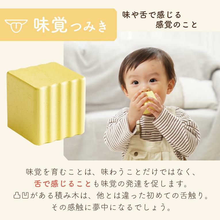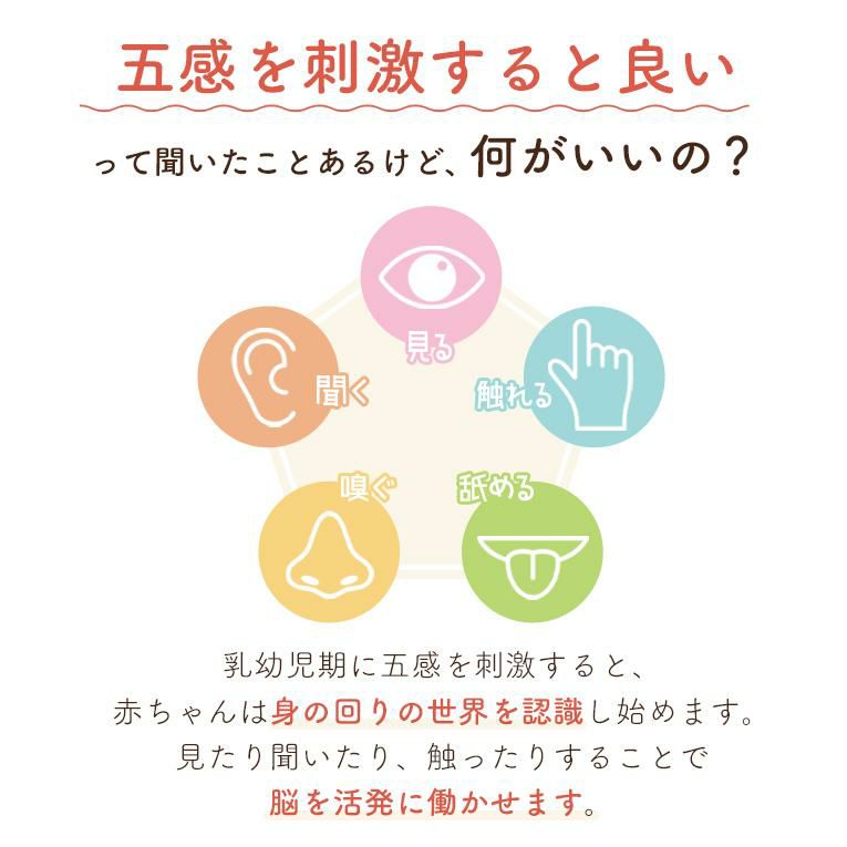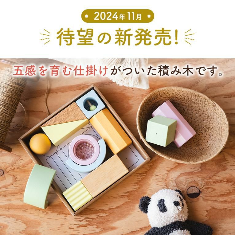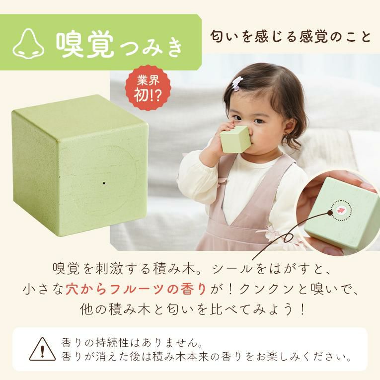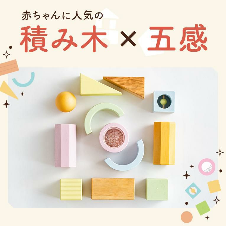 | 備考 | 視覚・聴覚・味覚・触覚・嗅覚の五感を育む5つの仕掛けパーツが入った積み木です。 出産祝いなどに気軽に送りやすいプライス♪